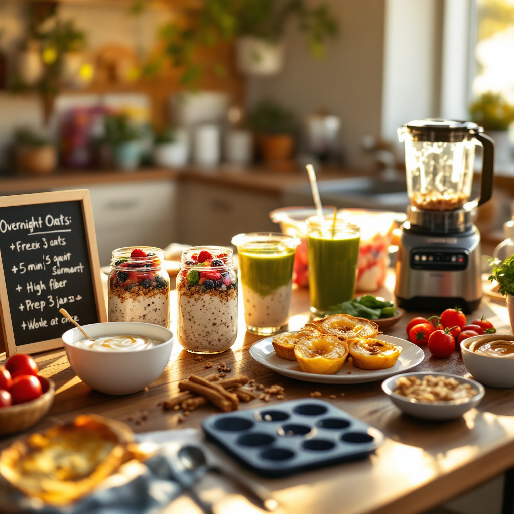 Breakfast IdeaPrep TimeNutrition BoostPro TipOvernight Oats<5 minHigh fiber, whole grainsPrep 3 jars at onceSmoothie2–3 minProtein, vitamins, fiberUse pre-packed freezer bagsGreek Yogurt Bowl2 minProtein, probioticsAdd nuts, seeds for crunchEgg Muffins<10 minProtein, veggiesBake ahead, reheat as neededNut Butter Toast2 minHealthy fats, carbsSprinkle cinnamon for flavor